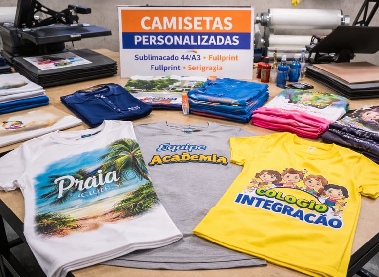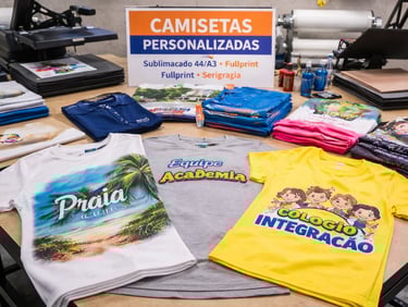 Aqui você encontrará camisetas personalizadas em sublimação A4 / A3 e fullprint e também em serigrafia. Estampamos também em tecidos fornecidos ou não pelo cliente.